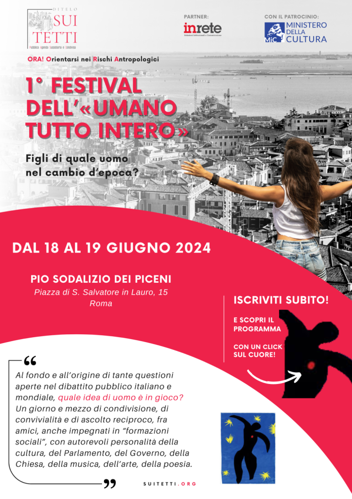 Partecipa al primo Festival dell’Umano tutto intero, il 18 e 19 giugno 2024, presso il Pio Sodalizio dei Piceni, Piazza di S. Salvatore in Lauro 15, Roma.
