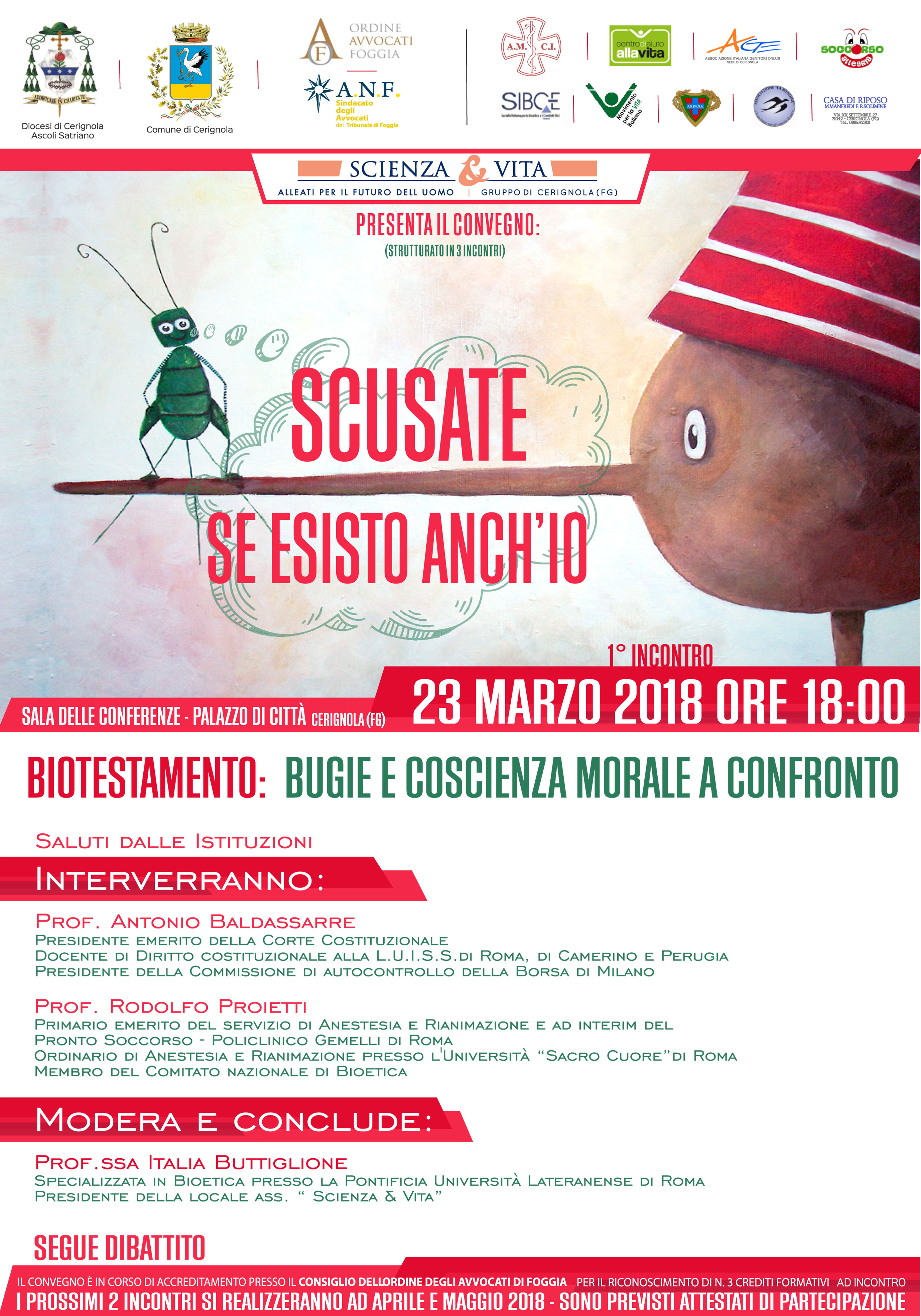 L’Associazione Scienza & Vita Cerignola ha organizzato in collaborazione con la Curia Vescovile di Cerignola – Ascoli Satriano, il Comune di Cerignola,Scienza & Vita naz, l’Ordine Forense di Foggia, A.M.C.I , S.I.B.C.E. e le associazioni locali: Anpana- Movimento per la Vita – La Rondine – A.G.E. – Centro di aiuto alla Vita- Centro per anziani”Solimine”- Donne più d’Europa – Soccorso allegria presenta il Convegno (strutturato in 3 incontri) “ Scusate se esisto anch’io “ .