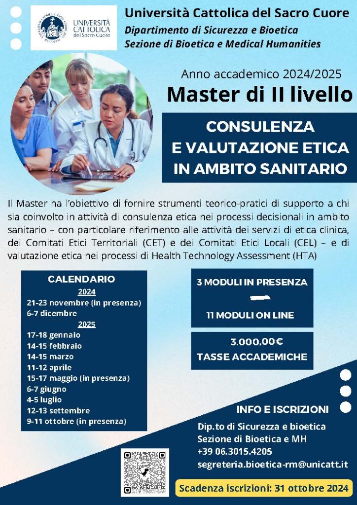 Il Master, che avrà luogo da novembre 2024 a ottobre 2025 con 3 moduli in presenza (Roma) e 11 online, ha l’obiettivo di fornire strumenti teorico-pratici di supporto a chi sia coinvolto in attività di consulenza etica nei processi decisionali in ambito sanitario – con particolare riferimento alle attività dei servizi di etica clinica dei Comitati Etici Territoriali (CET) e dei Comitati Etici Locali (CEL) – e di valutazione etica nei processi di Health Technology Assessment (HTA).