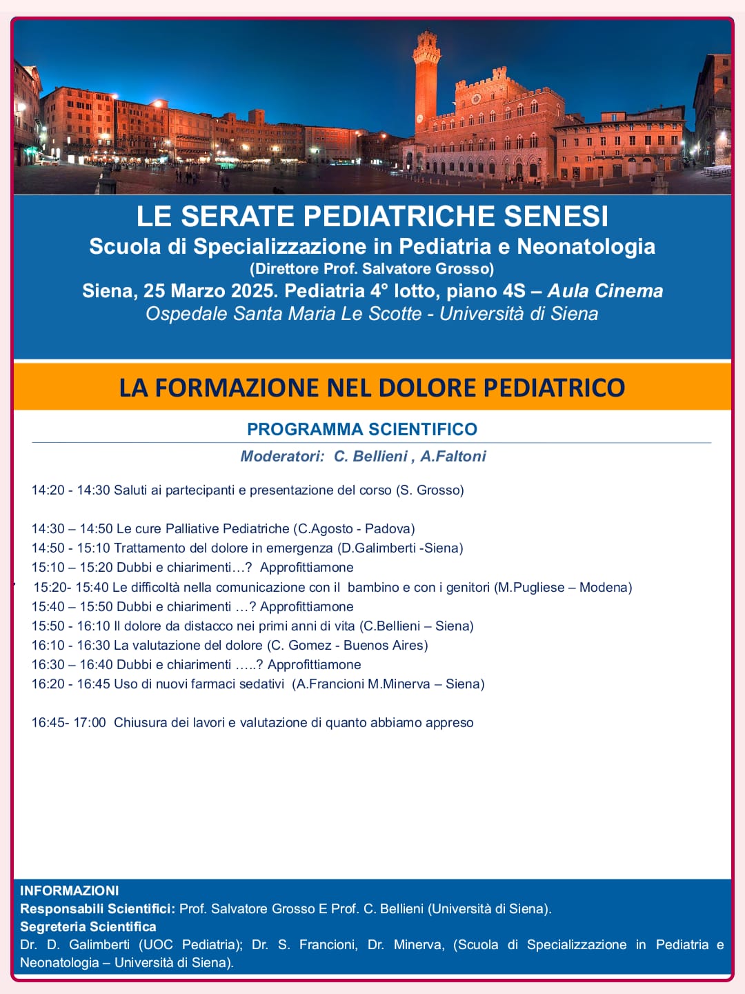 “Serate pediatriche senesi” è un’iniziativa, nata nel 2024, che prevede incontri di approfondimento sulla salute dei più piccoli, organizzati dal professor Salvatore Grosso, direttore della Pediatria dell’Azienda ospedaliero-universitaria Senese e della Scuola di Specializzazione in Pediatria dell’Università di Siena.
