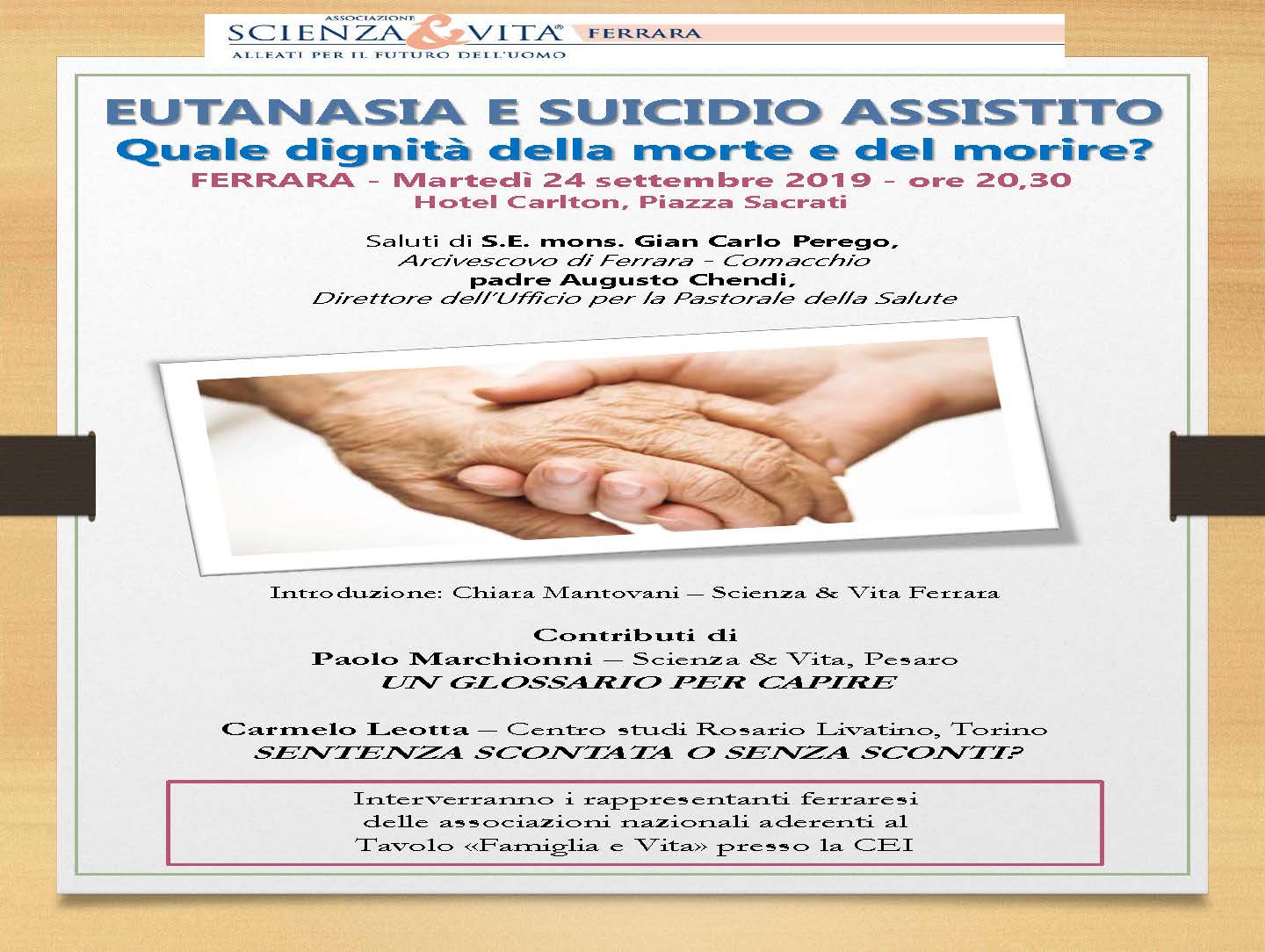 Martedì 24 Settembre 2019 a Ferrara, dalle ore 20.30, si terrà il Convegno dal titolo “Eutanasia e suicidio assistito. Quale dignità della morte e del morire?” organizzato dall’Associazione Scienza & Vita di Ferrara presso l’Hotel Carlton in Piazza Sacrati.