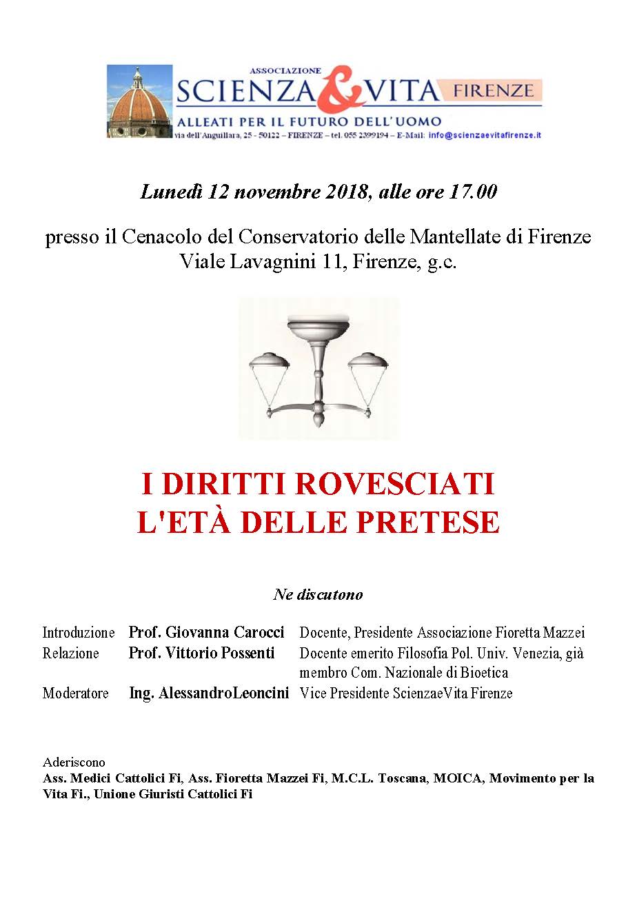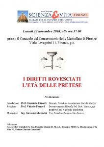 L’Associazione Scienza & Vita Firenze ha organizzato l’evento “I diritti rovesciati l’età delle pretese” presso il cenacolo del Conservatorio delle Mantellate di Firenze, Viale Lavagnini n. 11 (Firenze), dalle ore 17,00.