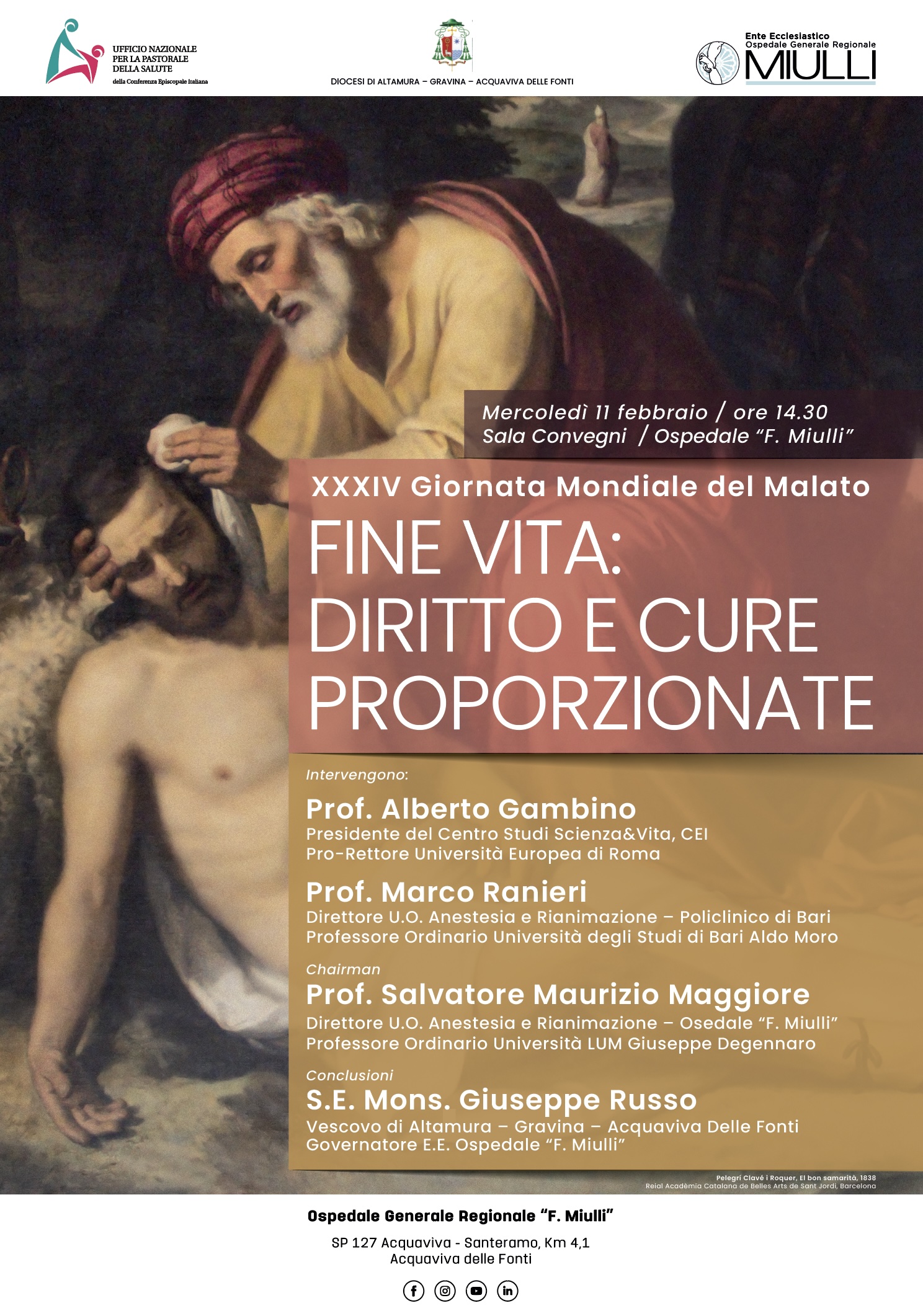 Il momento conclusivo dell’incontro sarà affidato a S.E. Monsignor Giuseppe Russo, Vescovo della Diocesi di Altamura-Gravina-Acquaviva delle Fonti e Governatore dell’Ospedale “F. Miulli”. Le sue riflessioni permetteranno di sintetizzare i punti emersi durante il confronto, ribadendo l’impegno dell’istituzione nel promuovere una cultura della cura che, in sintonia con lo spirito della Giornata Mondiale del Malato, sappia coniugare l’eccellenza della tecnica con la profonda attenzione pastorale e umana verso chi soffre.