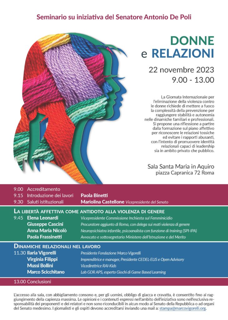 Programma: 9.00 Accreditamento | 9.15 Introduzione dei lavori Paola Binetti | 9.30 Saluti istituzionali Mariolina Castellone Vicepresidente del Senato La libertà affettiva come antidoto alla violenza di genere | 9.45 Elena Leonardi Vicepresidente Commissione Inchiesta sul Femminicidio | Giuseppe Cascini Procuratore aggiunto di Roma, con delega sui reati violenza di genere | Anna Maria Nicolò Neuropsichiatra infantile, psicoanalista con funzione di training (SPI-IPA) | Paola Frassinetti Avvocato e sottosegretario Ministero dell’Istruzione e del Merito Dinamiche relazionali nel lavoro | 11.30 Ilaria Vigorelli Presidente Fondazione Marco Vigorelli | Virginia Filippi Imprenditrice e manager, Presidente CEDEL-ELIS e Open Advisory | Mussi Bollini Vicedirettrice RAI-Kids | Marco Scicchitano Lab GDR APS, esperto Giochi di Game Based Learning | ore 13.00 Conclusioni