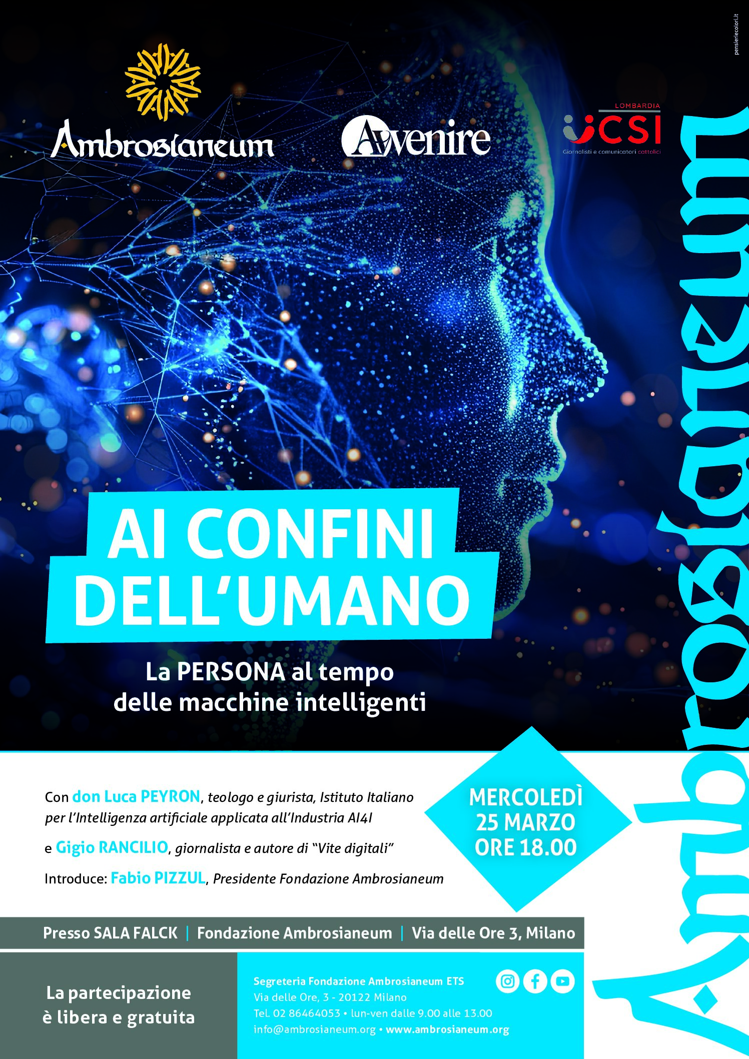 Un incontro con don Luca Peyron, teologo e giurista, membro dell’Istituto per l’Intelligenza artificiale applicata all’industria AI4I e Gigio Rancilio, giornalista e autore di Vite digitali. Introdurrà l’incontro Fabio Pizzul, presidente Fondazione Ambrosianeum ETS.