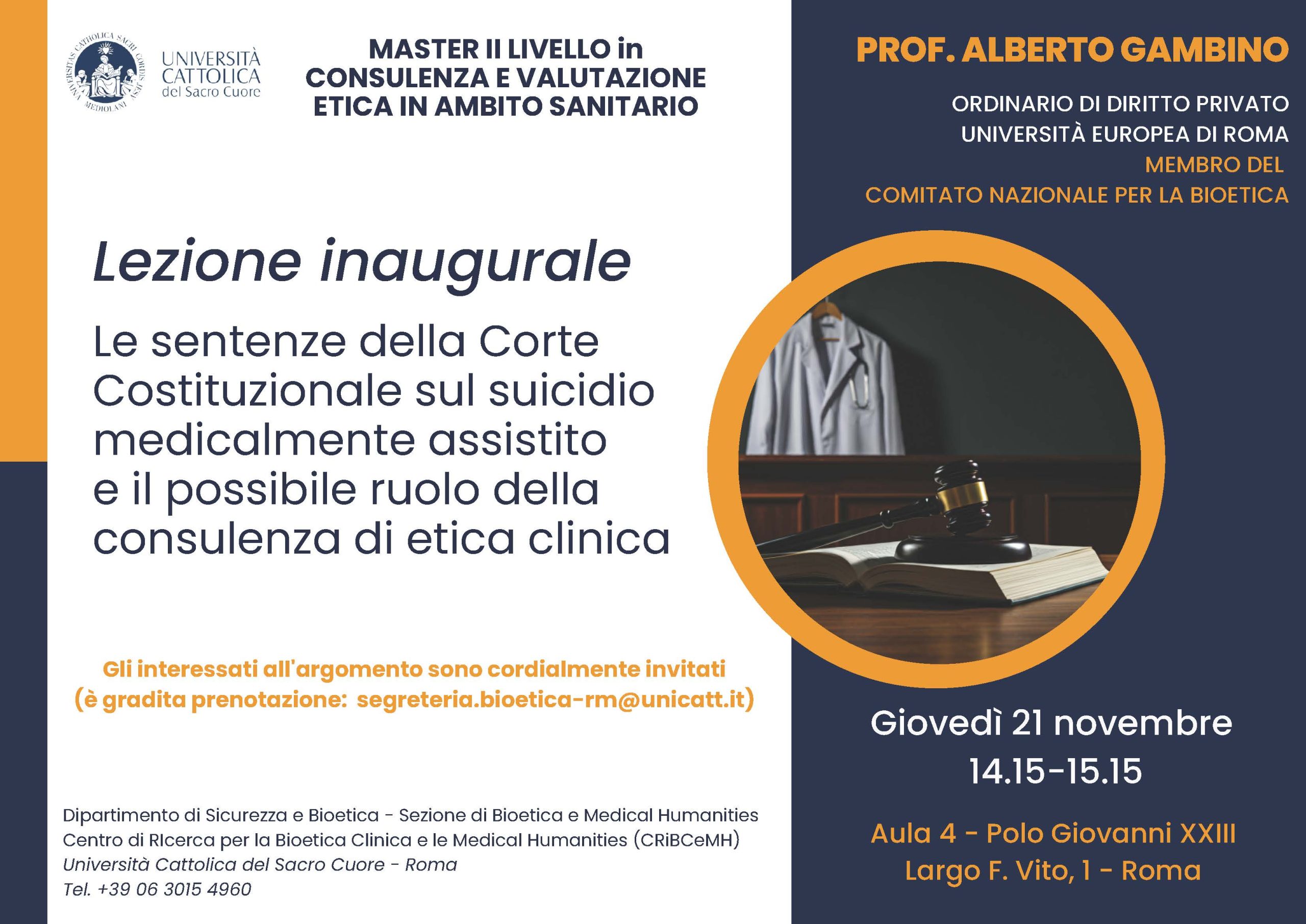 Giovedì 21 novembre 2024 dalle 14:15 alle 15:15 nell’Aula 4 del Polo Giovanni XXIII in Largo F. Vito 1 a Roma il Prof. Alberto Gambino, Presidente di Scienza & Vita, Ordinario di Diritto Privato presso l’Università Europea di Roma e membro del Comitato Nazionale di Bioetica, terrà la lezione inaugurale del Master di II livello in Consulenza e Valutazione Etica in ambito sanitario.