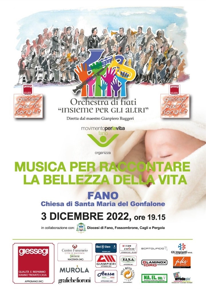 Il Movimento per la Vita di Fano, in collaborazione con la Diocesi, organizza, sabato 3 dicembre alle ore 19.15 nella chiesa di Santa Maria del Gonfalone, “Musica per raccontare la bellezza della vita” con l’Orchestra di fiati “Insieme per gli altri” diretta dal M° Giampiero Ruggeri. Partecipa ! SCARICA QUI LA LOCANDINA DELL’EVENTO