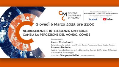 “Neuroscienze e Intelligenza artificiale. Cambia la percezione del mondo. Come?”. È il tema che sarà affrontato giovedì 6 marzo, alle ore 21, nell’auditorium del centro culturale di Milano, in Largo Corsia dei Servi, 4, nel capoluogo lombardo. Come cambia la percezione della realtà, di se stessi e della vita, nella dimensione avvolgente delle neuroscienze sul cervello e della Intelligenza artificiale, un dialogo sulle ultime frontiere delle neuroscienze cerebrali e l’Intelligenza artificiale.