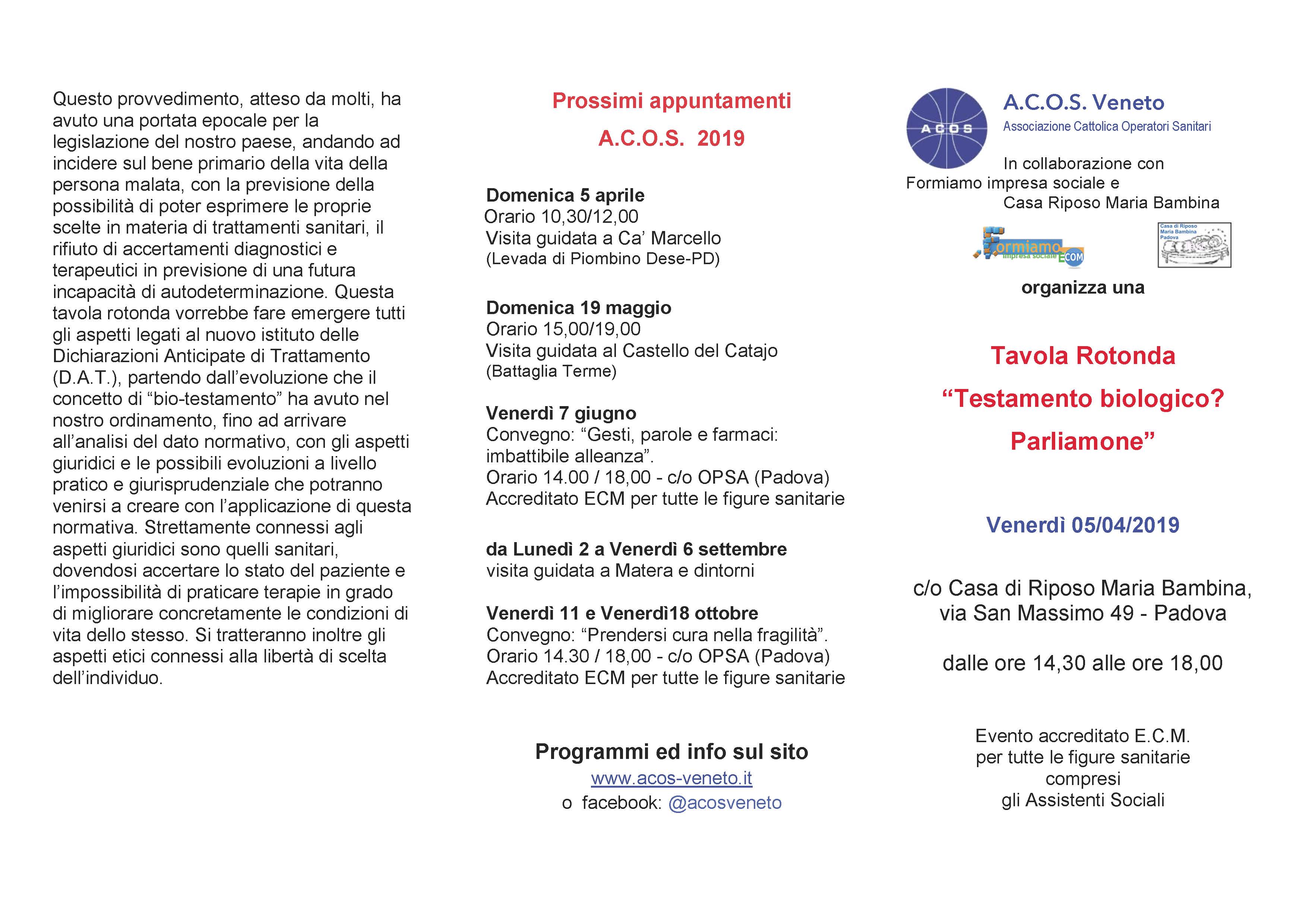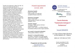 ACOS Veneto in collaborazione con Formiamo impresa sociale e casa Riposo Maria bambina ha organizzato una tavola Rotonda dal titolo “Testamento biologico? Parliamone” che si terrà a Padova, c/o Casa di Riposo Maria bambina, via San massimo n. 49, dalle ore 14:30 alle ore 18:00.