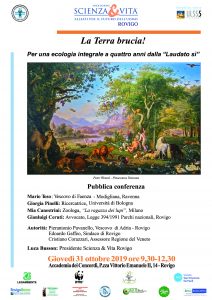 Giovedì 31 ottobre, dalle ore 9:30, presso l’Accademia dei Concordi, Piazza Vittorio Emanuele II, n. 14, a Rovigo la locale Associazione Scienza & Vita ha organizzato un Convegno pubblico dal titolo La Terra brucia! Per una ecologia integrale a quattro anni dalla “Laudato sì”.