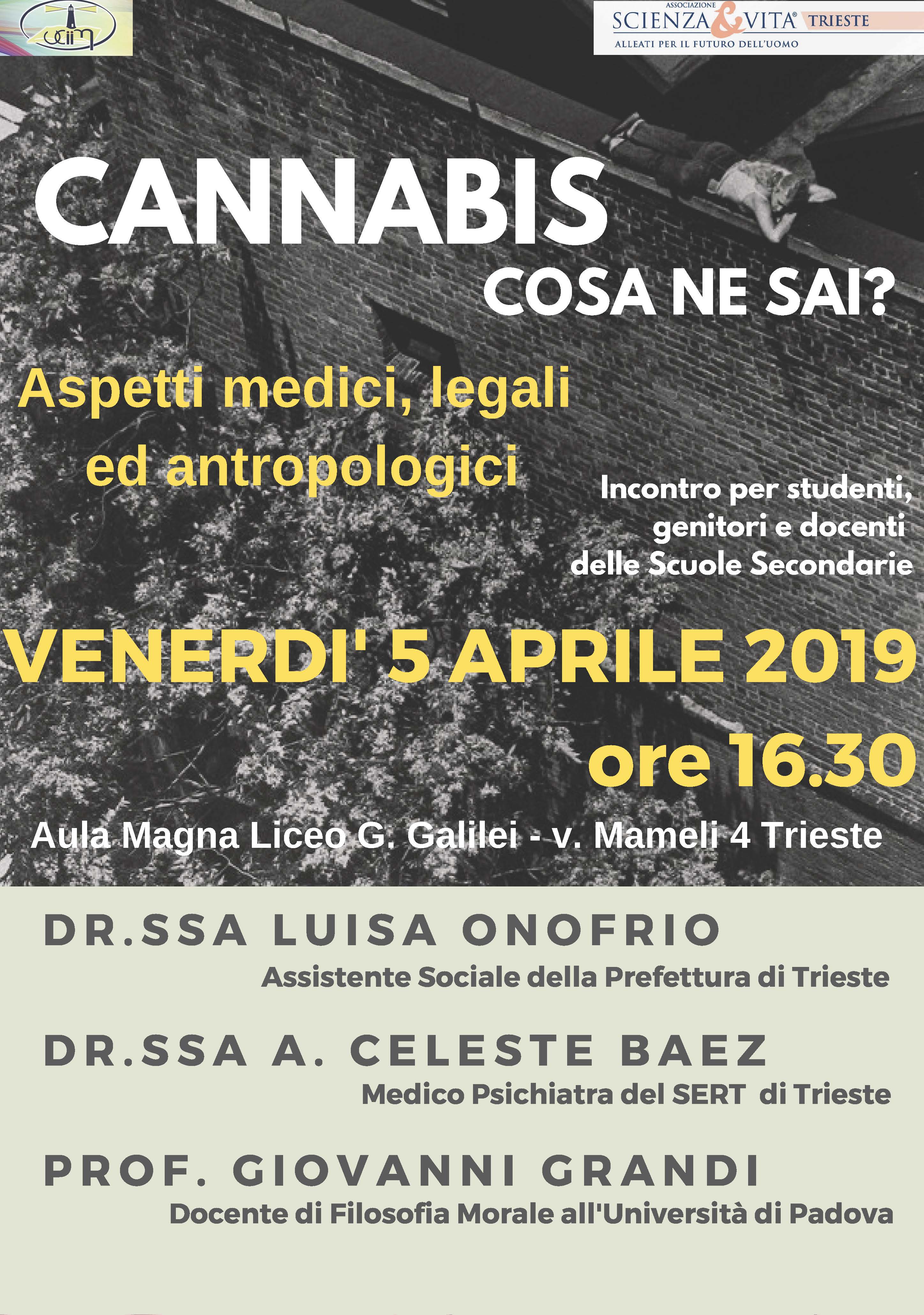 “Cannabis cosa ne sai? Aspetti medici, legali ed antropologici.” Incontro organizzato dall’Associazione S&V Trieste con studenti, genitori e docenti delle Scuole Secondarie, che si terrà dalle ore 16:30 presso l’Aula Magna del Liceo G. Galilei, Via Mameli n. 4 a Trieste, il giorno venerdì 5 aprile 2019.