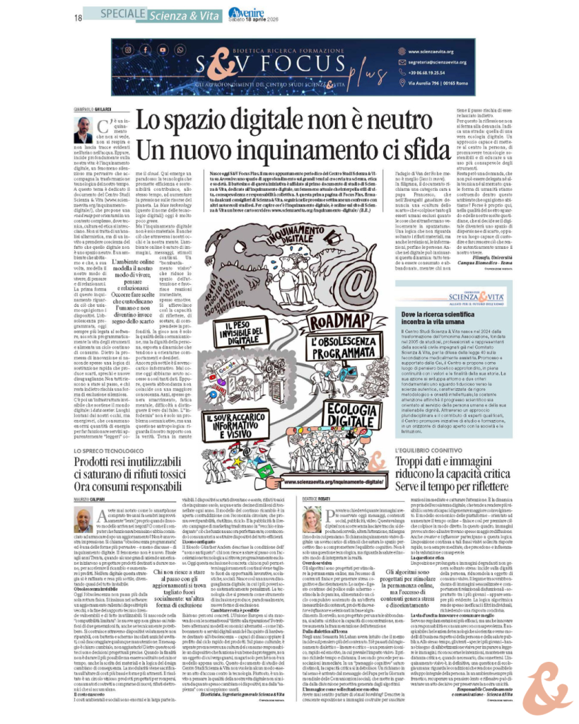 Il battesimo di questa iniziativa è stato affidato al primo documento di studio di Scienza & Vita, dedicato all’inquinamento digitale, un fenomeno attuale che interpella stili di vita, consapevolezza e responsabilità collettiva.