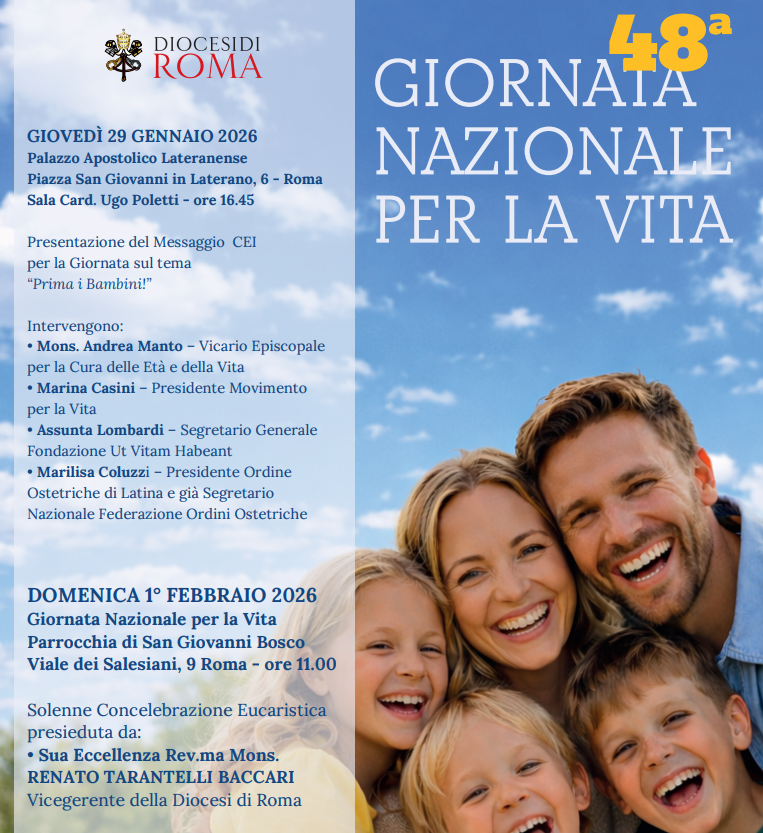 Domenica 1 febbraio 2026 Giornata Nazionale per la Vita presso la Parrocchia di San Giovanni Bosco in Viale dei Salesiani, 9 Roma alle ore 11.00